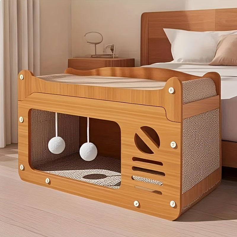 The 2-in-1 Wall Cat Bed and Scratching Post is crafted for both rest and play, making it a smart choice for indoor cats. Its space-saving wall-mounted design includes a scratchable surface and ventilation slots to keep your pet cool during warmer months. Built with durable cardboard, it offers a cozy elevated bed and an outlet for natural scratching behavior.